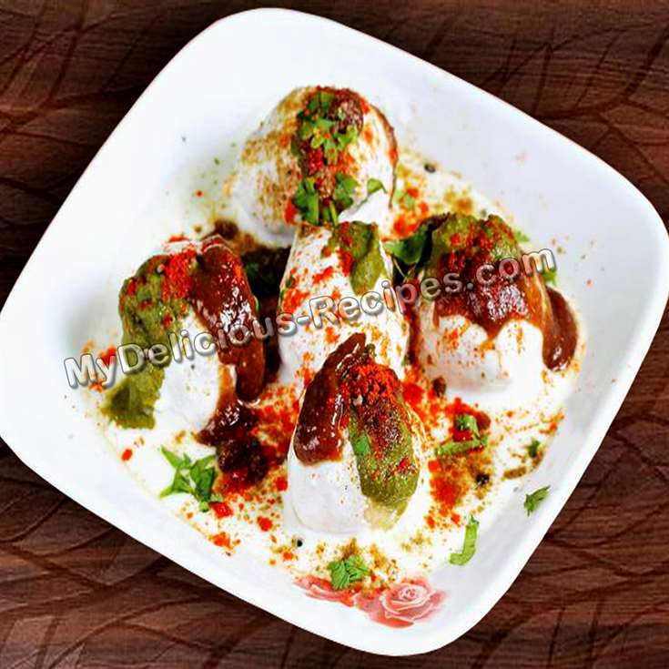 Dahi Bhalle or Dahi Vada - is a soft and delicious street food which is very popular in India especially in North India. The dish does not require any introduction, no one will refuse to eat it due to its soft texture and delicious taste. To make the delicious, soft and spongy Vada or Bhalle, a thick batter is required to made from urad dal and deep fried in the shape of small balls, before serve these soft bhalle are soaked in lukewarm water for some time, while serve add curd, sweet tamarind chutney and spicy green chutney over these soaked bhalle, finely spiced with some spices. Finally garnished with red chili powder, roasted cumin powder, and coriander leaves giving it a spicy taste and an attractive look. Get the detailed recipe of Dahi Bhalle at MyDelicious Recipes.